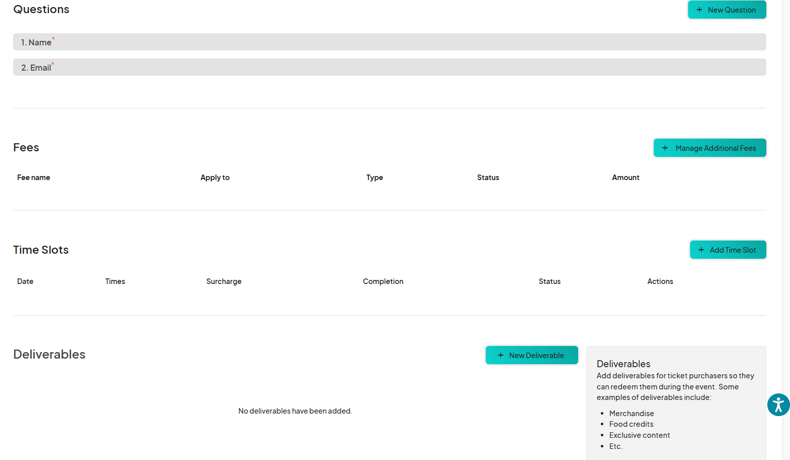 - Questions: Do you need to ask ticket buyers questions before they purchase their tickets?