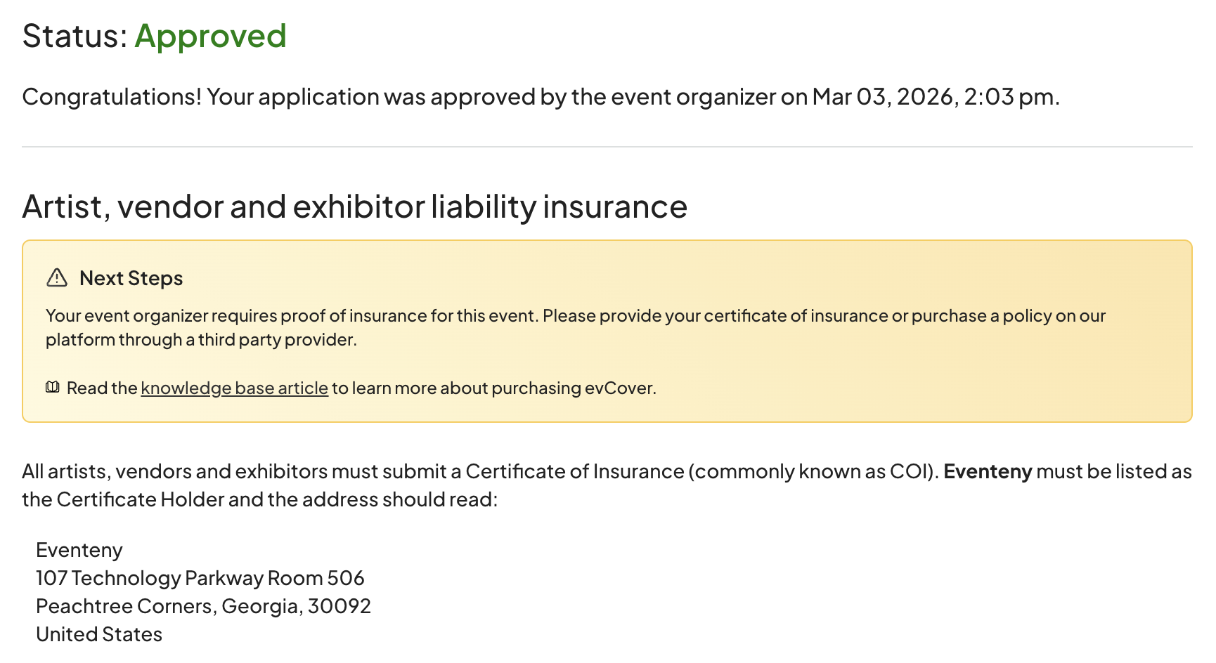 If the vendor has applied for evCover but has not received a decision yet, they should contact Eventeny customer support and provide their policy number, which can be found on their submission confirmation page.