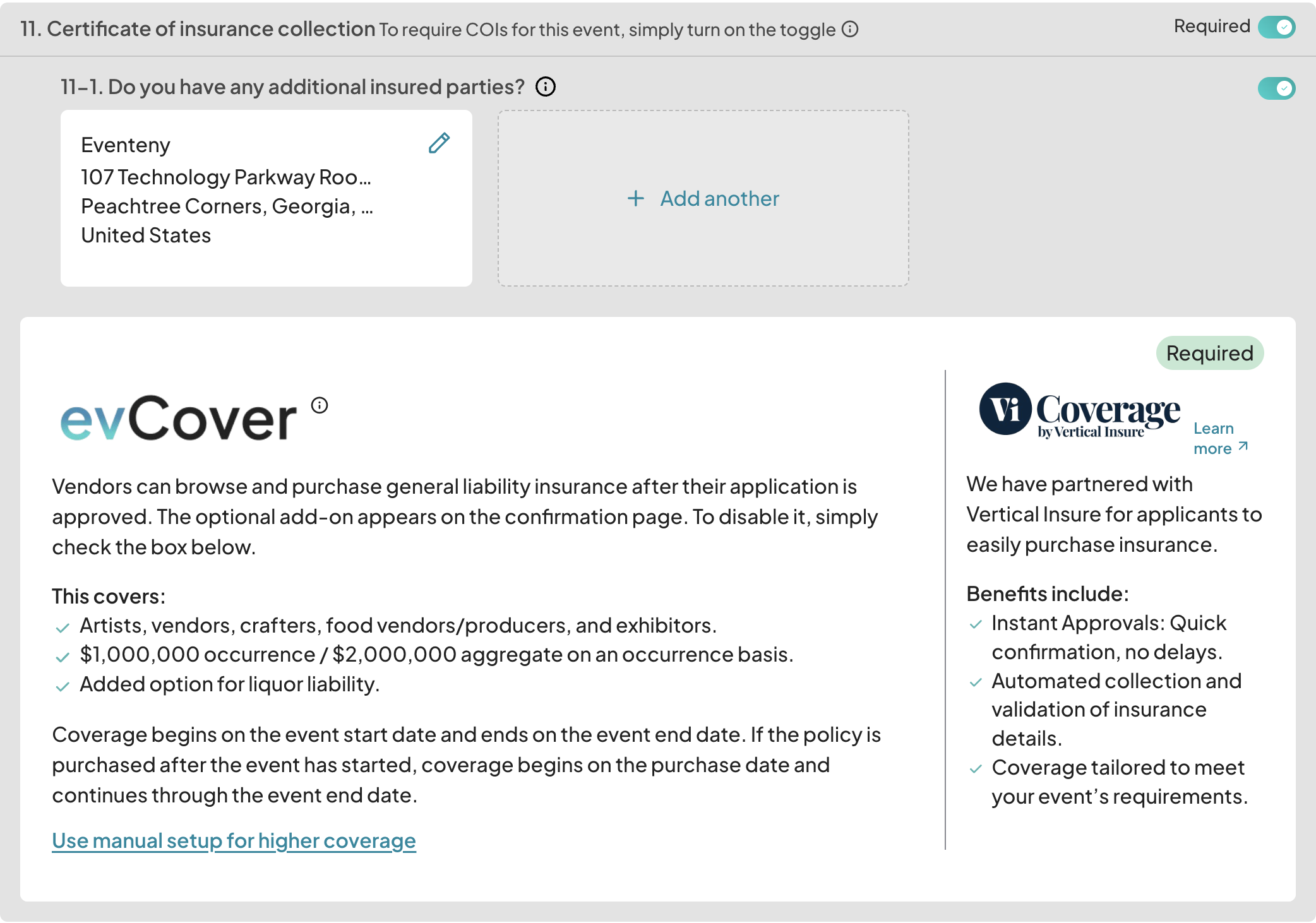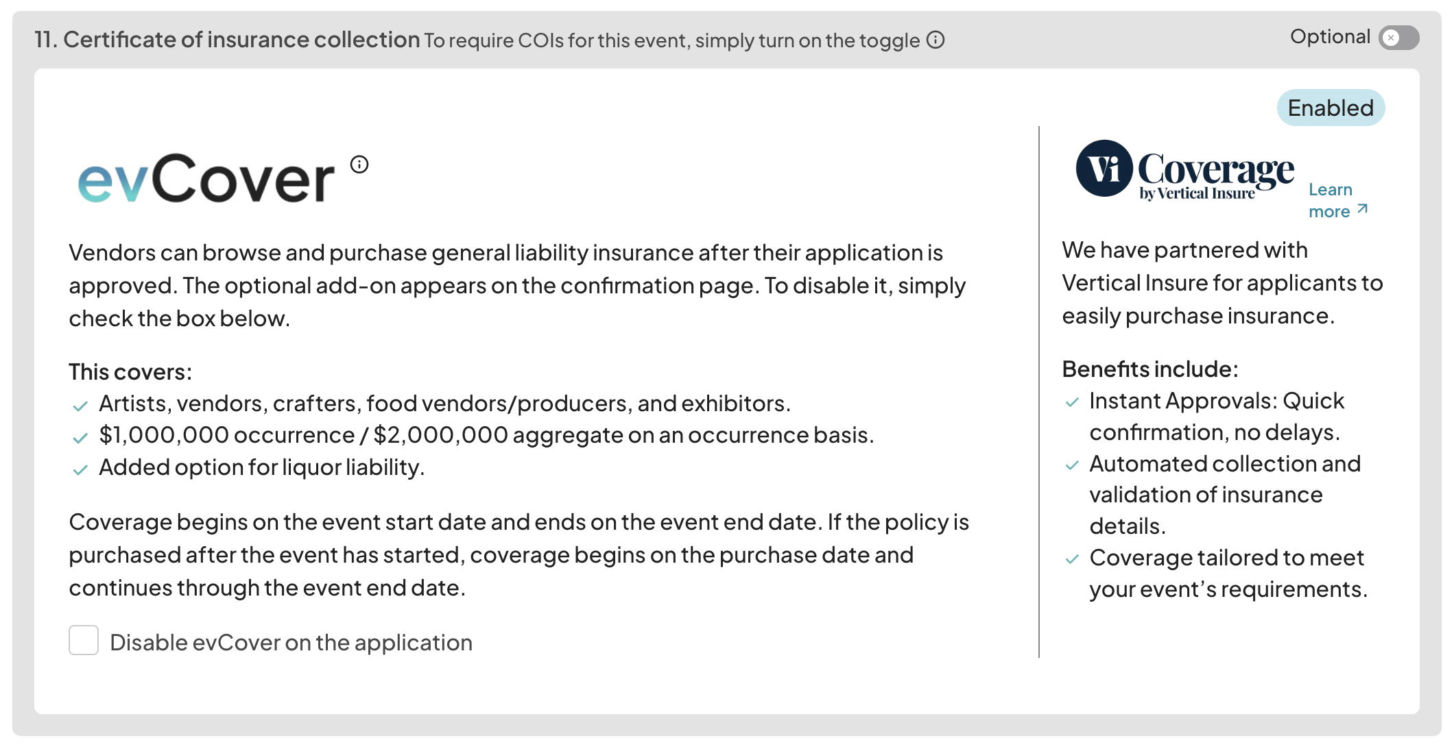 If your event doesn't meet the qualifications (e.g., event type or coverage limits), the evCover option will be unavailable. You can still collect insurance manually from vendors and specify the required coverage.