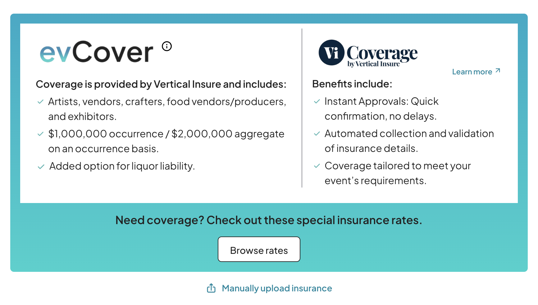 If the vendor doesn't qualify for evCover, they can manually upload their own insurance or reach out to our partner, Vertical Insurance, for a direct quote.