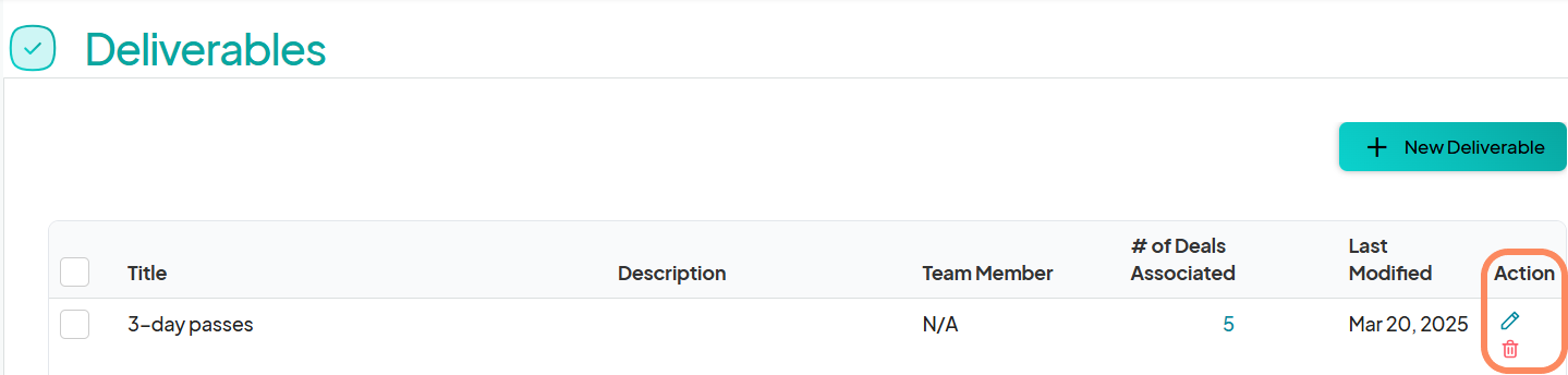 Click the pencil icon in the Action column to update the title, description, or assigned team member, or click the trash icon to remove a deliverable from the list.