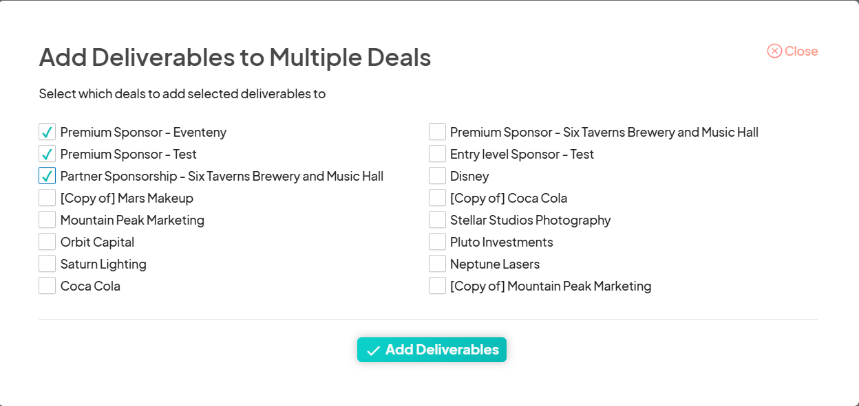 Use the checkboxes on the left to select multiple deliverables, with the option to add multiple deliverables to one or more sponsor deals.