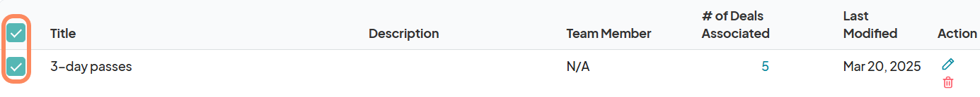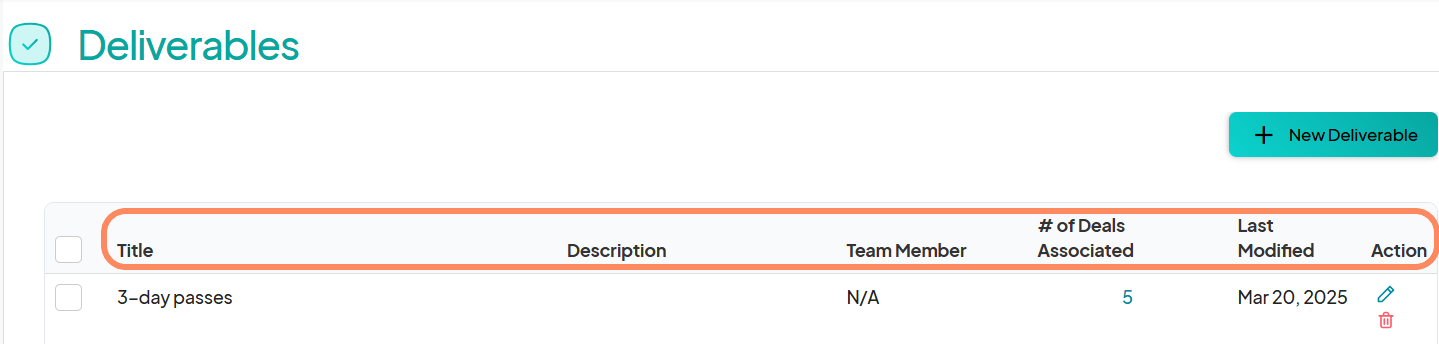 Once deliverables have been created, you can manage them from the deliverable list view. The list displays each deliverable’s Title, Description, Assigned Team Member, Number of Deals Associated, Last Modified Date, and Action options.