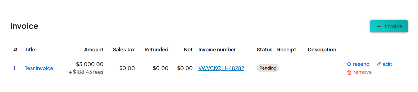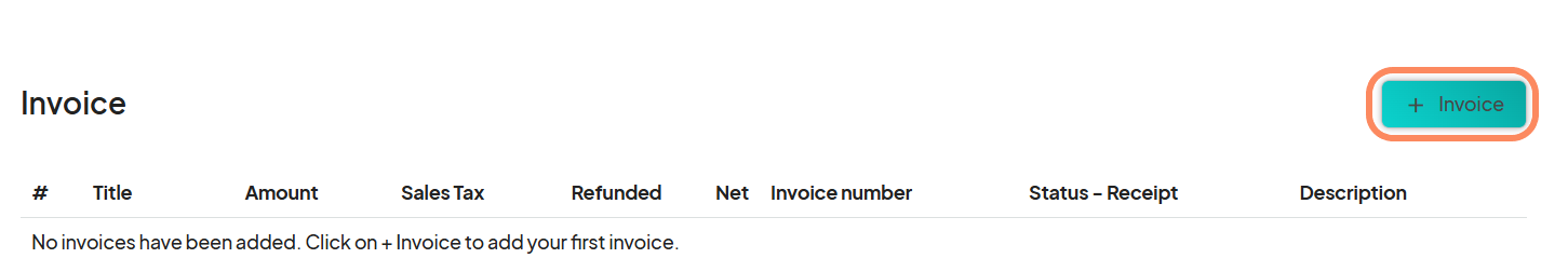 Scroll down to the "Invoice" section and click on the "+Invoice" button to create a new invoice.