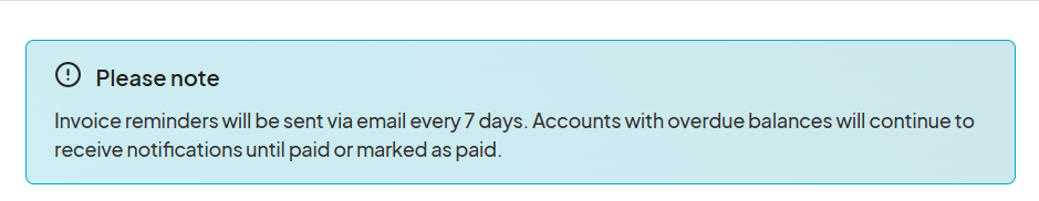 - At the top, you’ll see a blue information box explaining that invoice reminders are automatically sent every 7 days until the invoice is paid or marked as paid. This applies to all overdue balances.