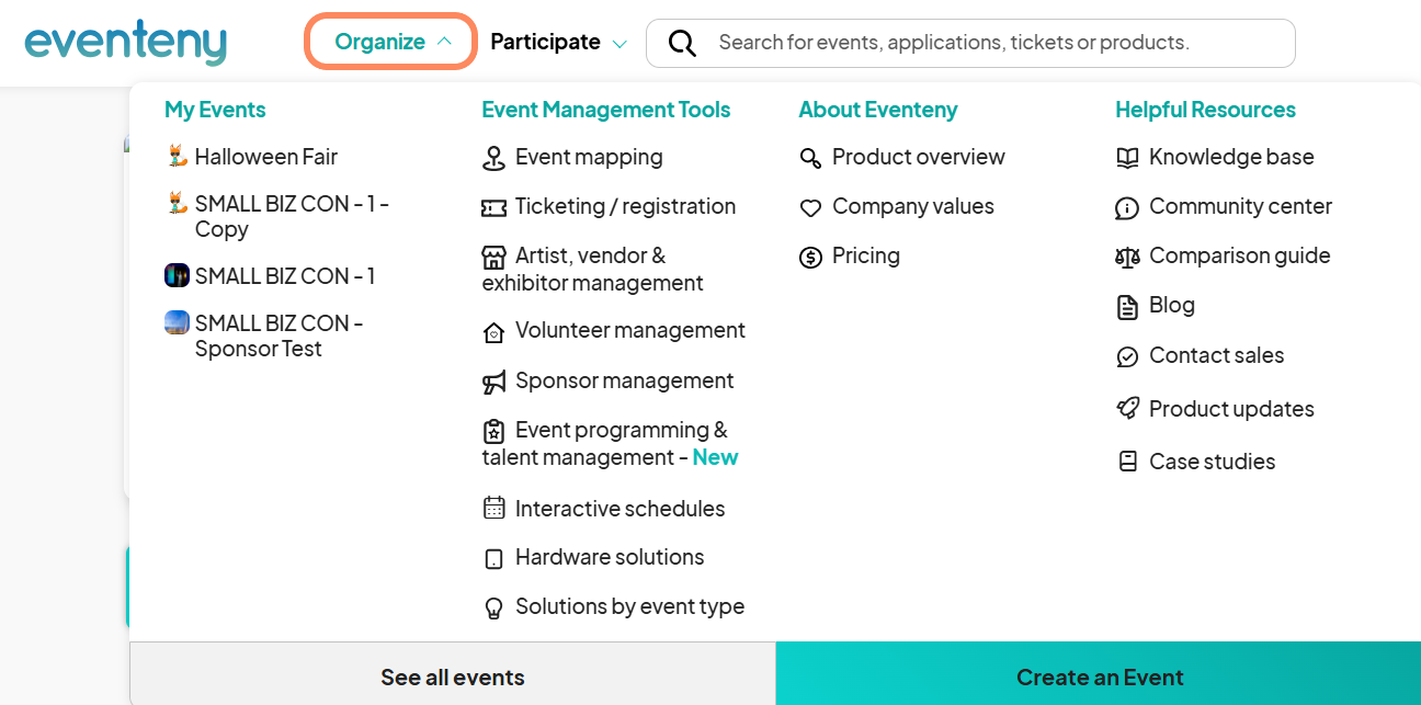 - At the top of the homepage, hover over the "Organize" tab and select the event you wish to work with.