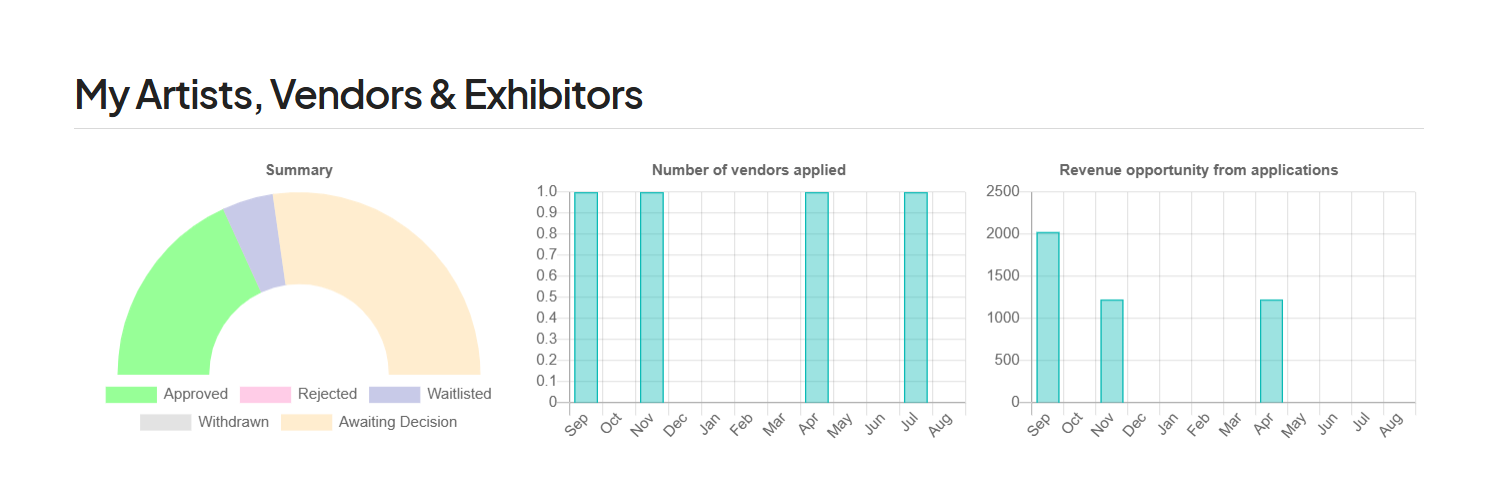 - This opens the master list of all applicants tied to your account. At the top of the page, you’ll find summary charts to help you quickly understand vendor activity across all events: