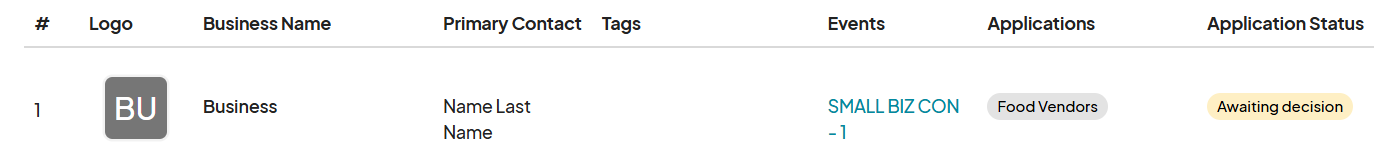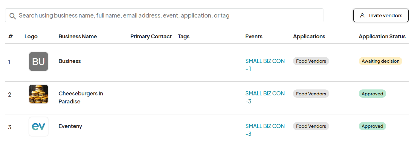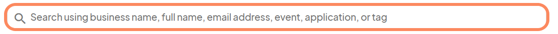 Search across all applicants using business name, contact, event, application, or tag.