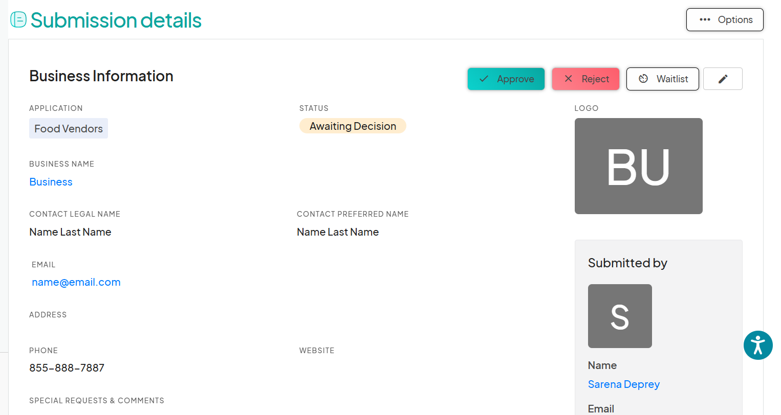 Logo & Business Name: Applicant identification.