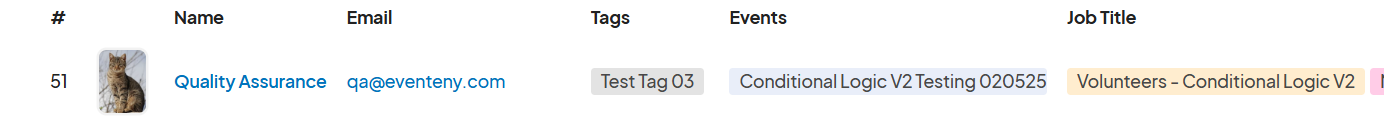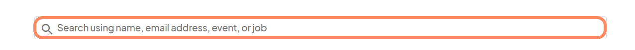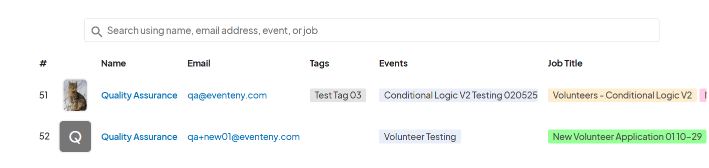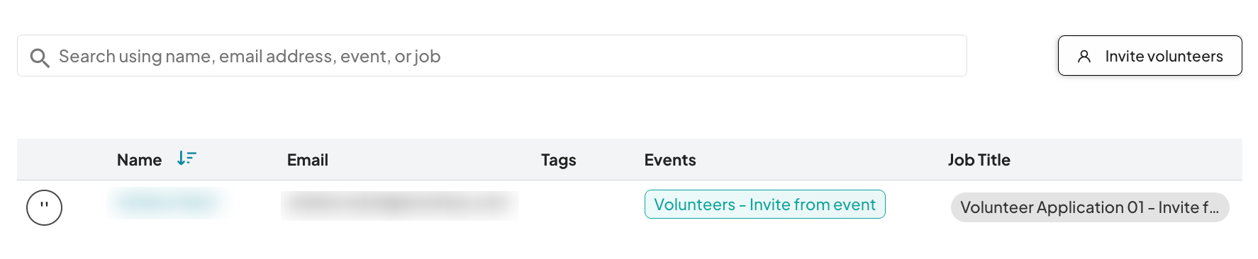 From the master list of all volunteers, you can search across all volunteers using name, email address, event, or job title.