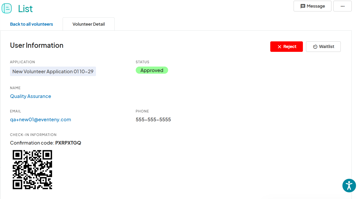 Below the charts, you’ll see the complete list of all volunteers who have ever applied to any of your events. Each entry includes: