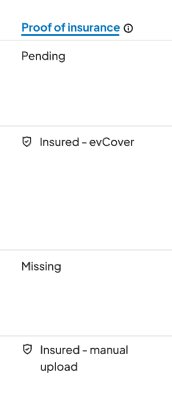 - In the "Proof of Insurance" column, you can view the insurance upload status, indicating whether applicants have insurance pending approval, insured by evCover, manually uploaded, or missing altogether.