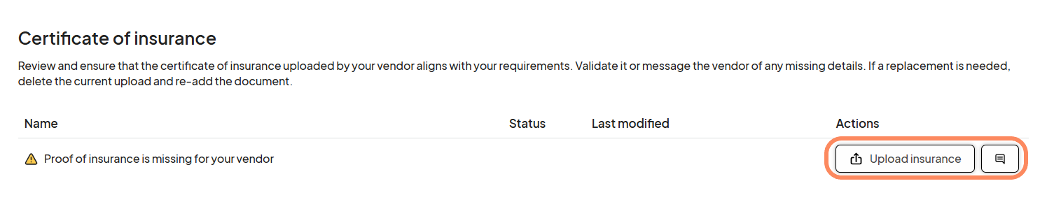 - Within the submission, you can view the status of the proof of insurance, see the last modified date, and take actions such as manually uploading the insurance or messaging the applicant about it.