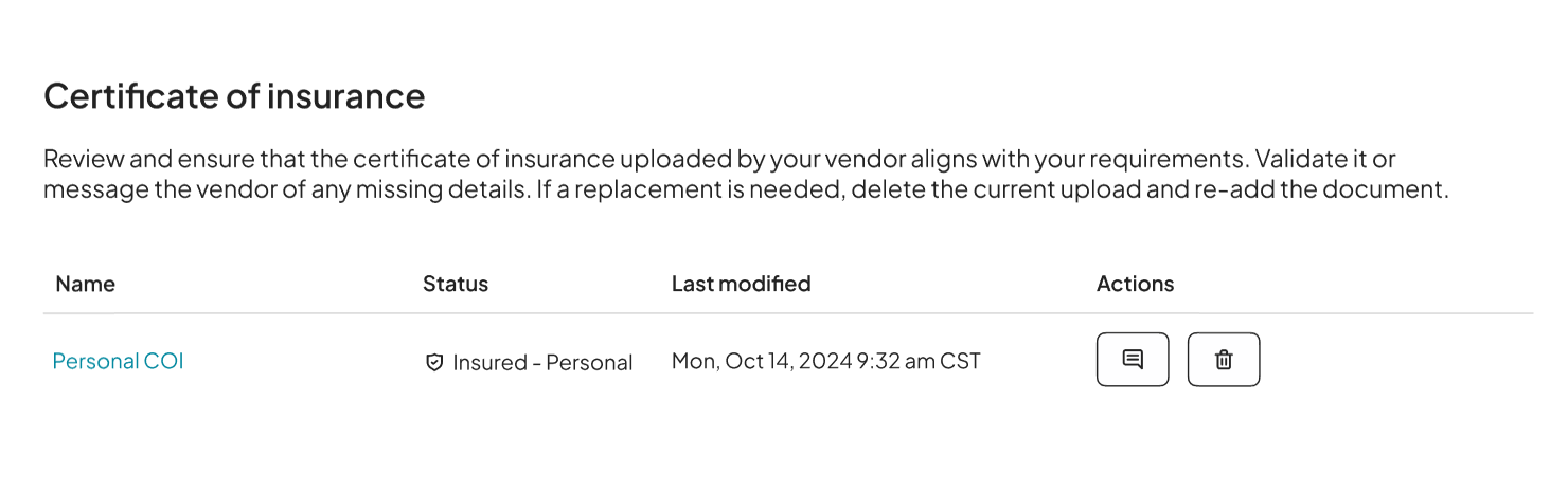 - If the applicant has manually uploaded their own insurance, the status will show as "Insured - Personal." You can view the file to ensure it meets your standards. If it doesn’t, you can delete the file and message the applicant to upload new insurance.