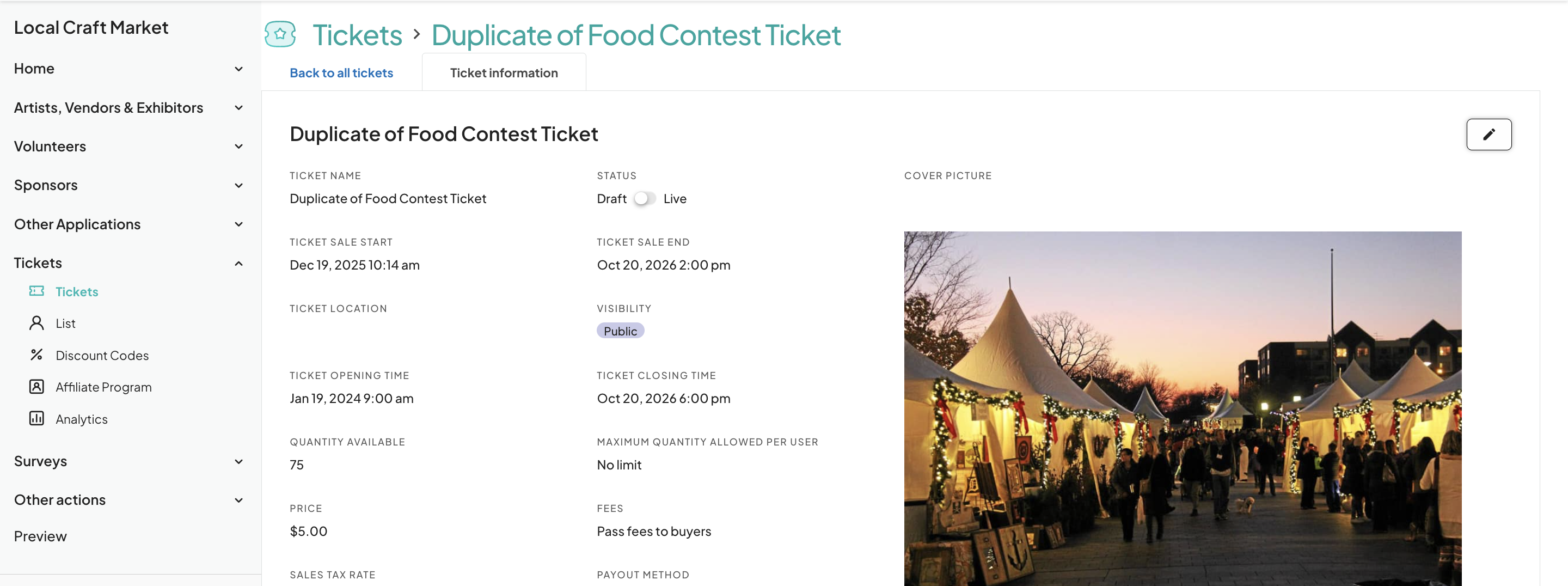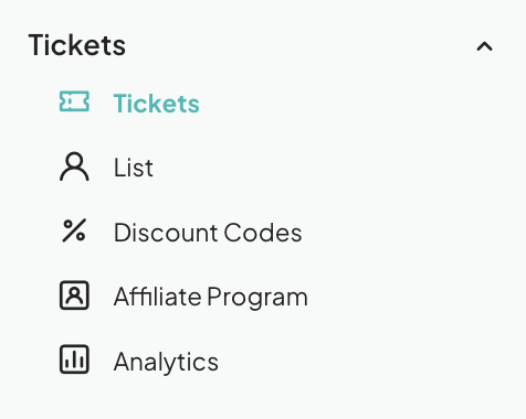 - This is your event dashboard. On the left sidebar, select "Tickets" under the "Tickets" tab.