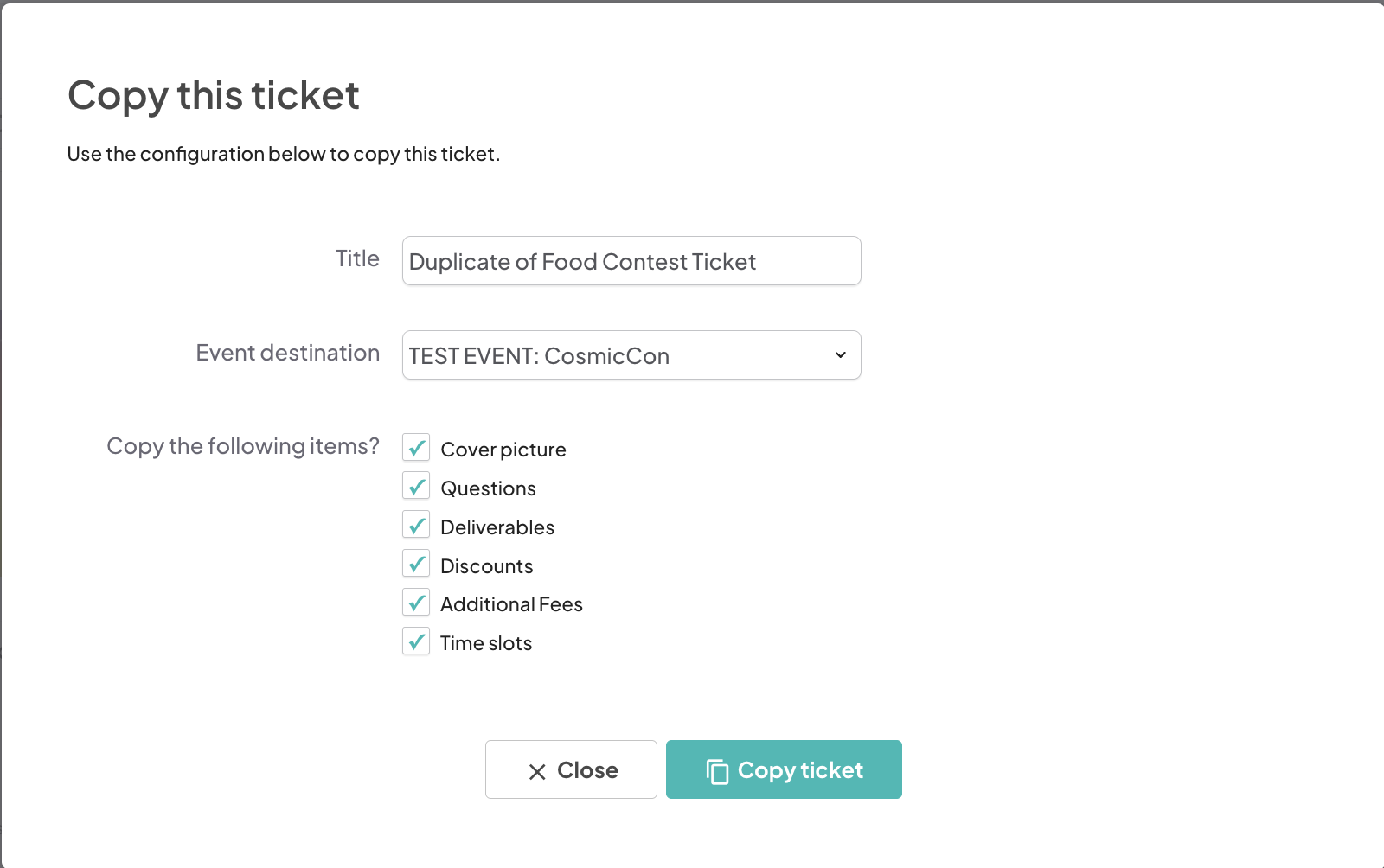 Once everything looks correct, click "Copy ticket" to create the duplicate in the selected event.