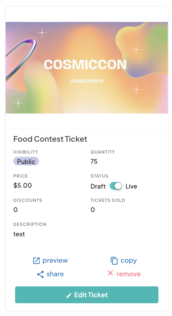 - This is your event dashboard. On the left sidebar, select "Tickets" under the "Tickets" tab.