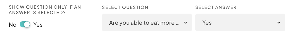 - To make the child question conditional to the parent question, toggle the "Show Question Only If An Answer Is Selected" option. Select the question and answer that must be completed before the conditional (child) question appears.