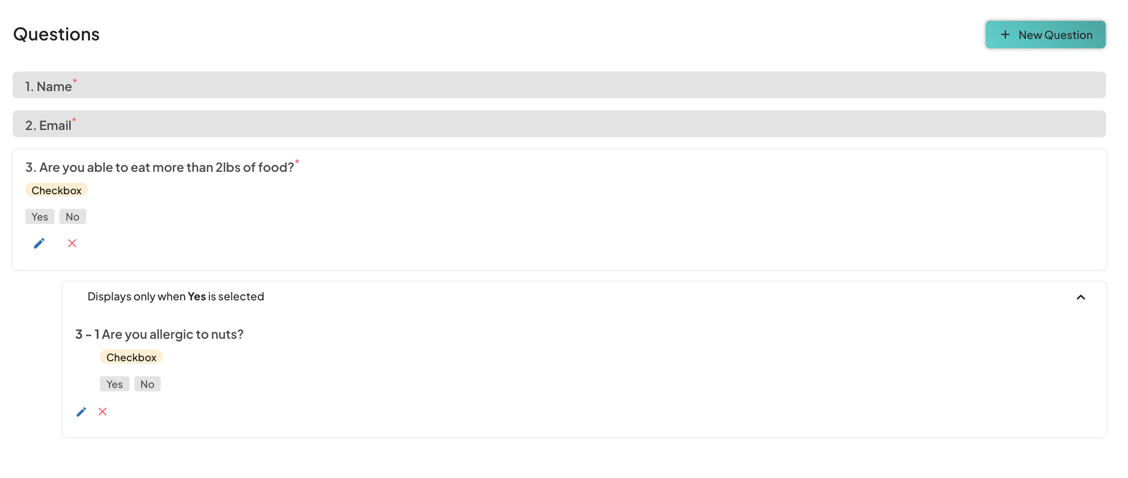 - Next, you will need to create another question that serves as the child question to the parent question, created in the steps above. Click on the "New Question" button again, select the answer type and fill in the answer choices as normal.