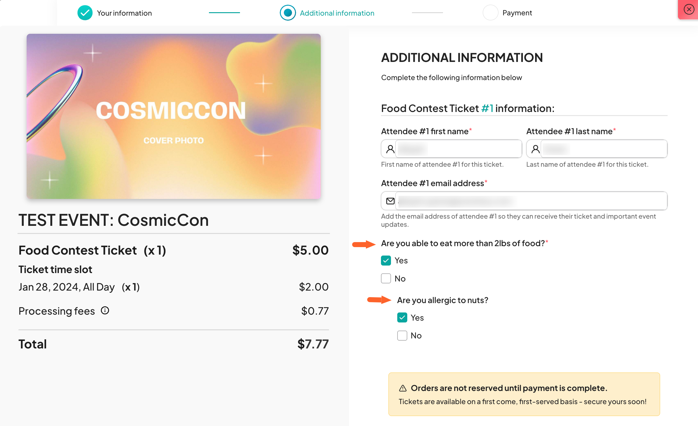- During the ticket checkout process, applicants selecting an answer to a conditional question will prompt additional questions to appear.
