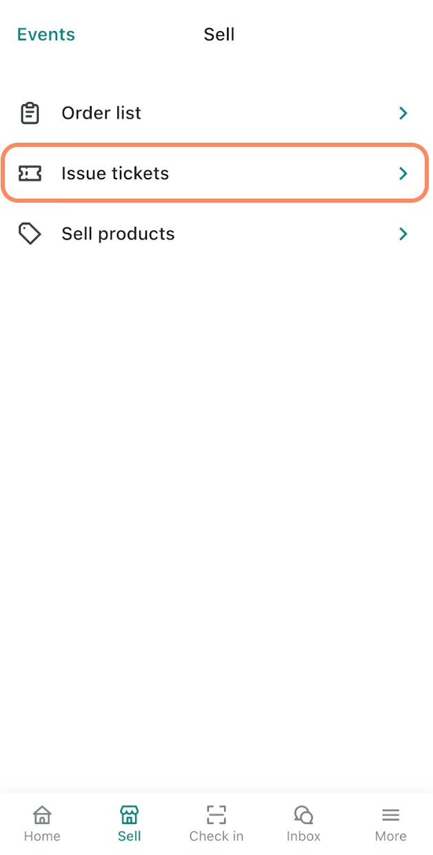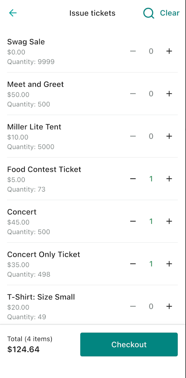 Choose the ticket type you want to sell and enter the quantity of tickets being purchased. If your event uses seat selection, you may also be prompted to select seats for the tickets being issued. Once the ticket quantity has been selected, tap Checkout.