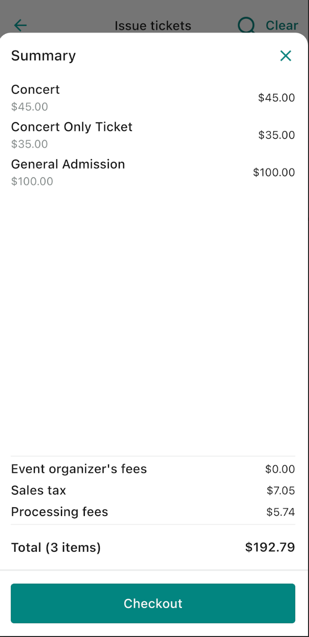 Once all details have been reviewed, tap Checkout to proceed with completing the ticket purchase.