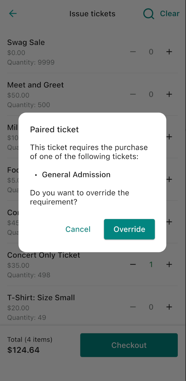 When issuing certain tickets, you may see a Paired ticket notification. This message appears when a ticket requires the purchase of another specific ticket type. The notification will list the required ticket that must be included in the order. For example, a ticket may require that a General Admission ticket is also purchased.