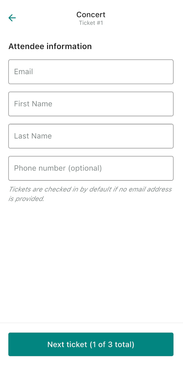 If multiple tickets are being issued, you will be prompted to enter information for each attendee individually. Once the required information is entered, tap Next ticket to continue to the next attendee until all tickets in the order have been completed.