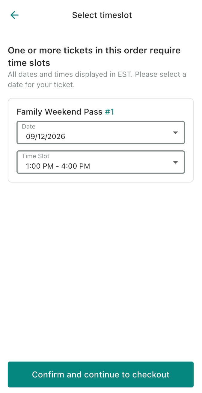 Some tickets require you to select a date and time slot before completing checkout. If this applies to your ticket, you will be prompted to choose your preferred date and time during the checkout process. If you want to set up time slots for your tickets, click here to learn more.