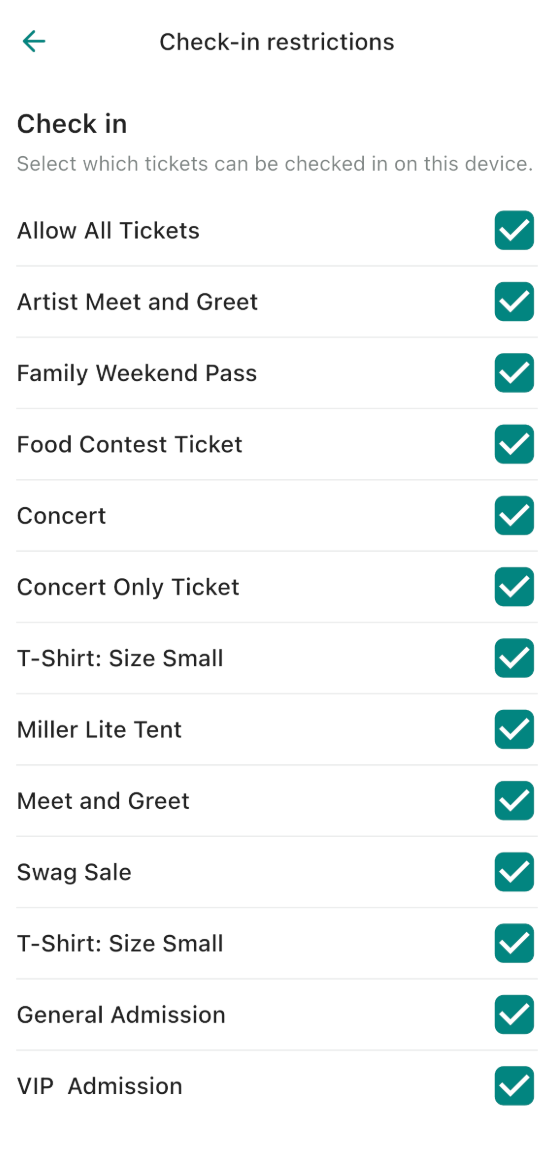 Check-In Restrictions: This allows you to control which ticket types can be checked in on your device. You can select specific ticket types (e.g., VIP, General Admission, Meet & Greet) or allow all tickets.