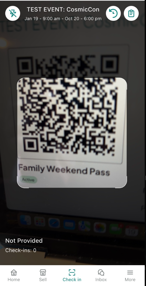 Once scanned, you’ll see the ticket type (e.g., Family Weekend Pass), the attendee’s name, and the ticket status. Tap Check in (if auto check-in is not enabled).