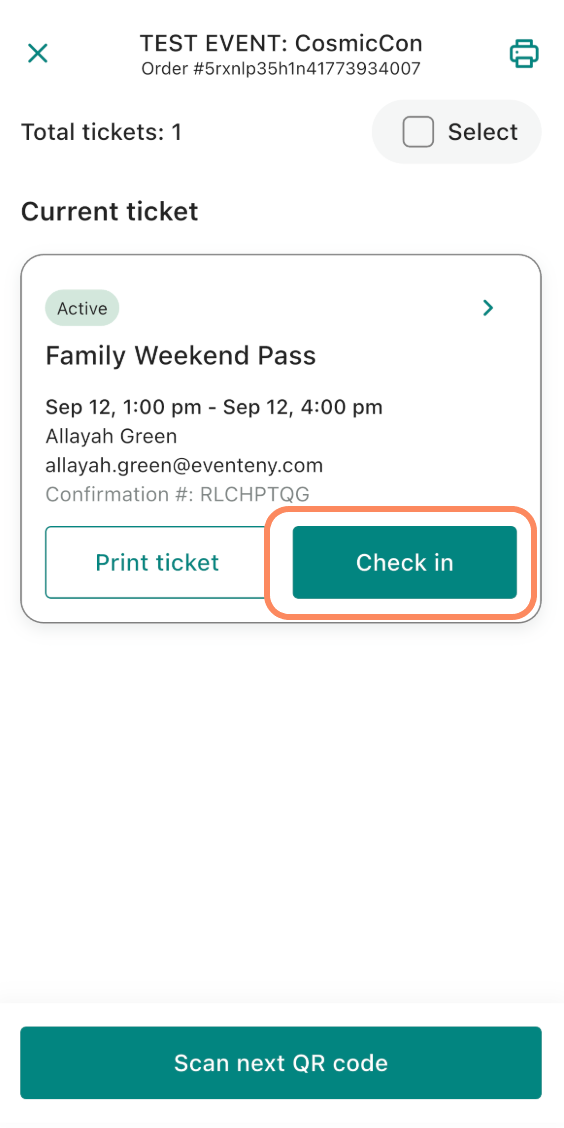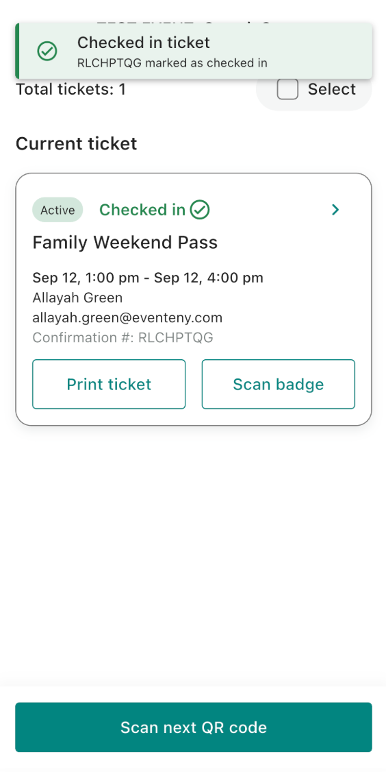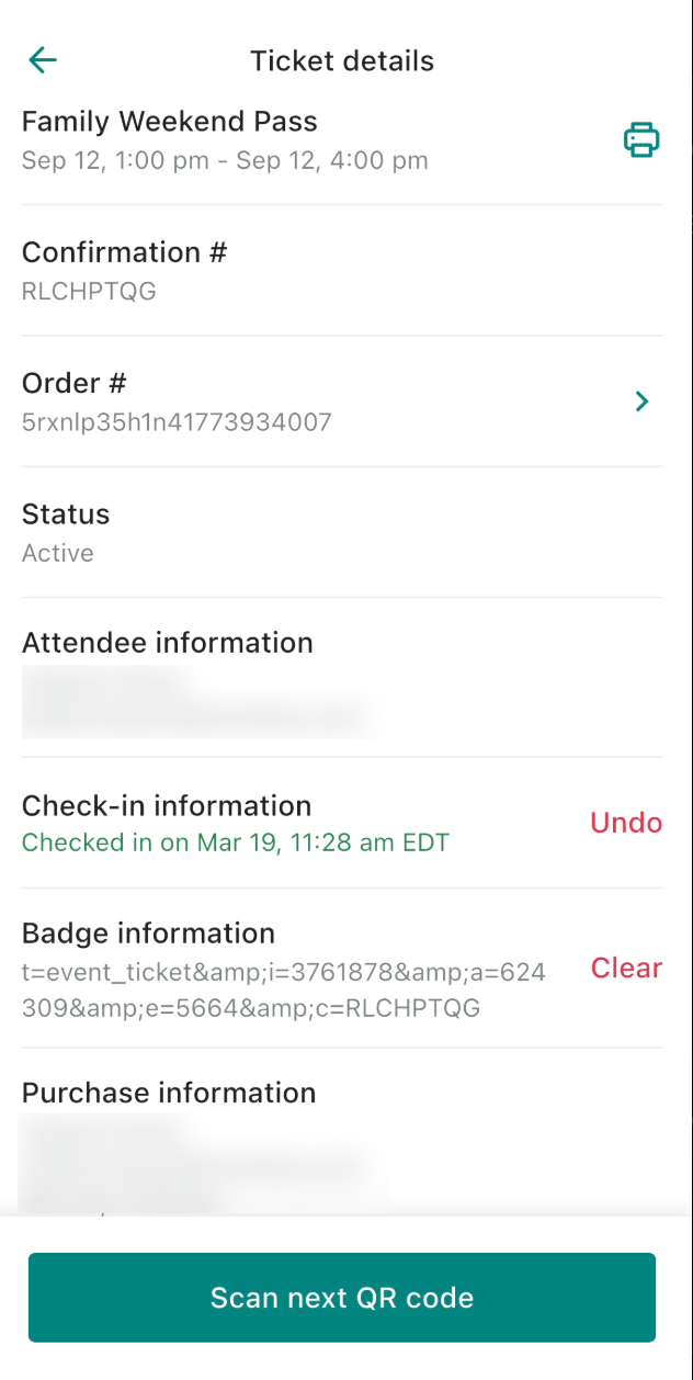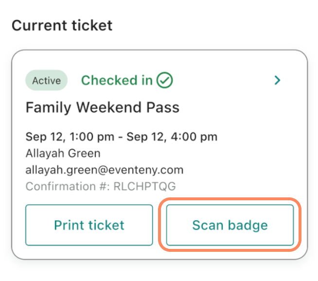 After check-in, you can tap into a ticket to view: check-in time and date, confirmation number, attendee information, badge assignment and more.