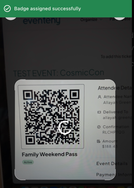 Scan the badge QR code. You’ll see a confirmation: “Badge assigned successfully”.