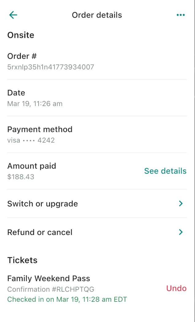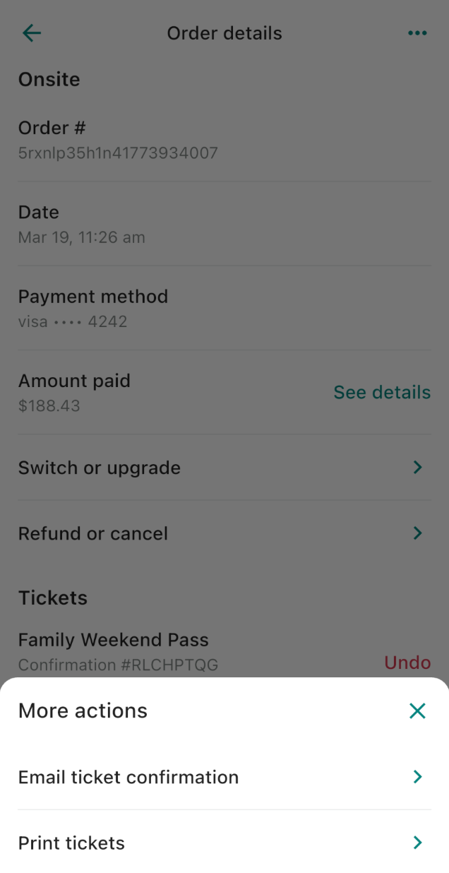 You can also tap the three-dot menu in the top right to access more actions, such as emailing the ticket confirmation or printing the ticket.