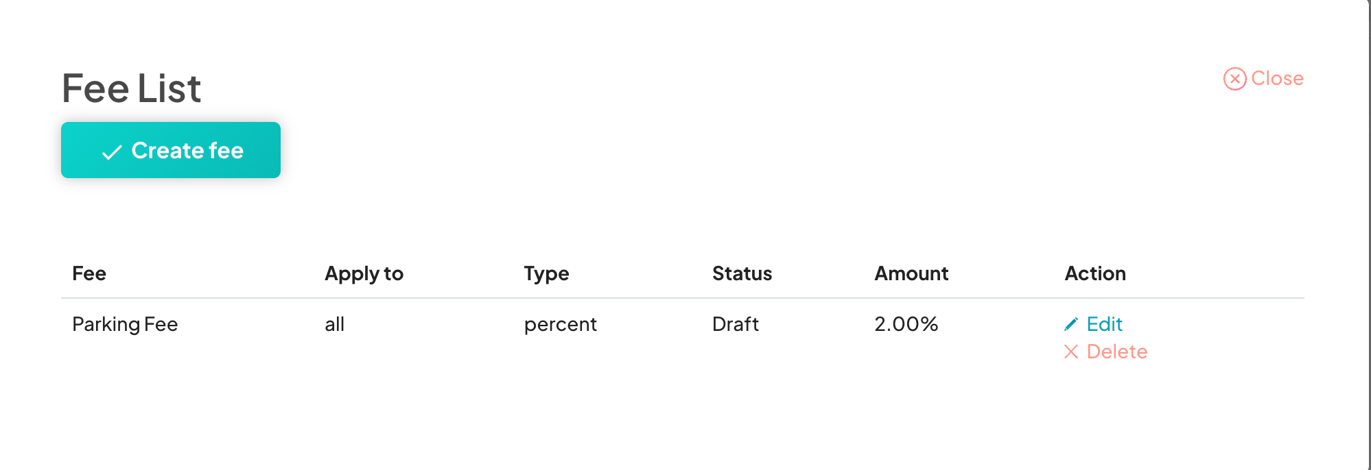 Confirm that the fee is applied as expected by scrolling down to the Fees section. You should see the fee you created listed. Click on Manage Additional Fees to add new fees and edit or delete existing fees.