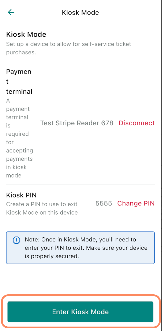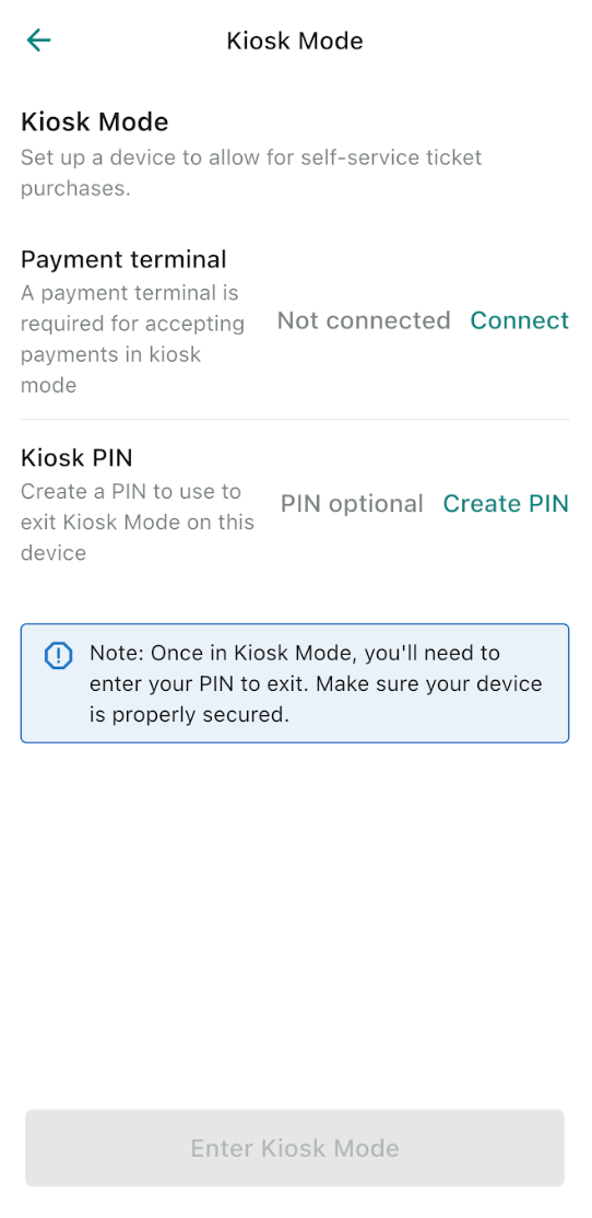 - Once your payment terminal is connected and your Kiosk PIN has been set, you’re ready to enable kiosk mode. Click on Enter Kiosk Mode. The device will then switch into self-service mode, allowing attendees to begin purchasing tickets directly from the device.