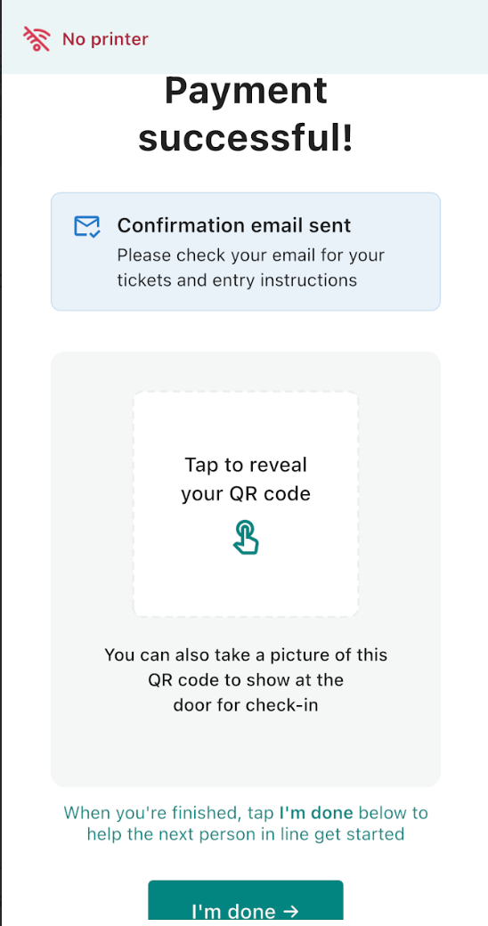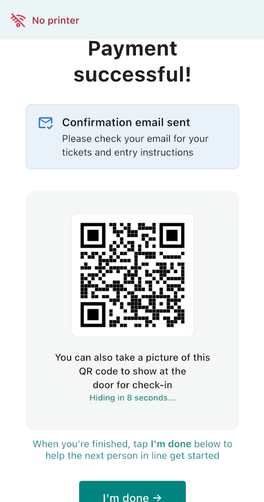 Once revealed, the QR code will appear on screen for entry and check-in. Attendees can take a photo of the QR code to use at the event entrance. When finished, the attendee will tap “I’m done” to reset the device and allow the next attendee to begin their purchase.
