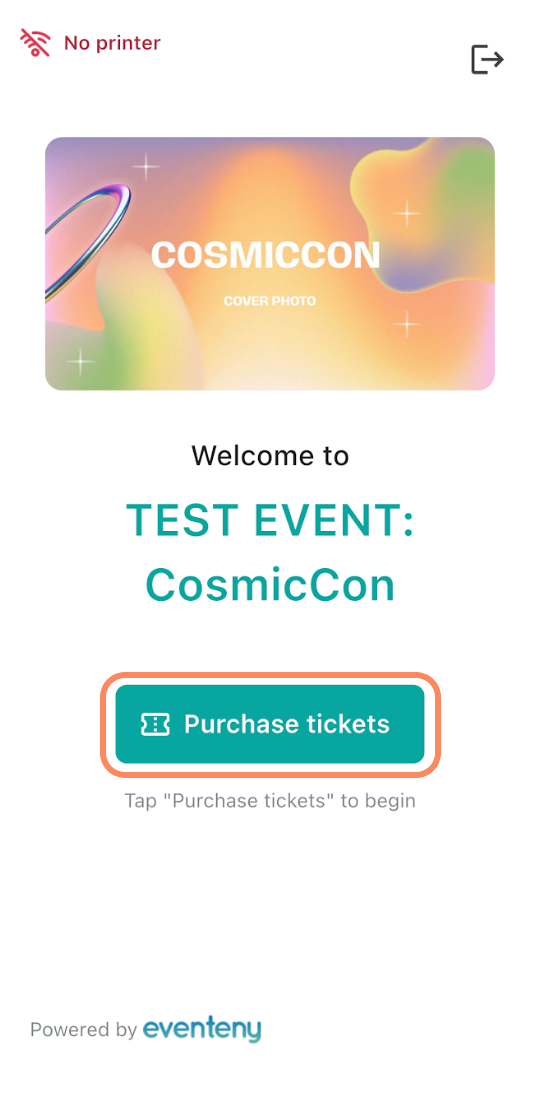 The device will display a self-service home screen for your event. To start purchasing tickets, attendees simply tap “Purchase tickets” and follow the prompts to complete their order.