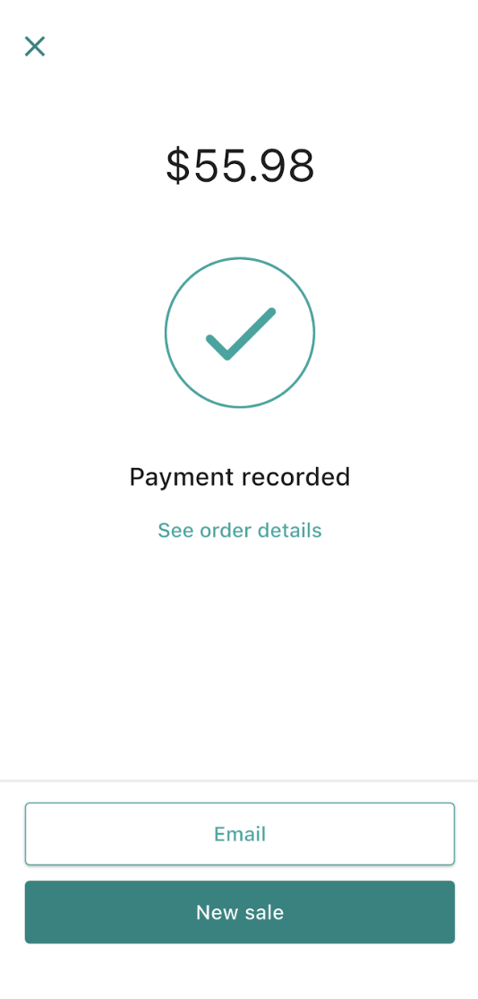 - Once payment is complete, a Payment recorded screen will appear From here, you can: tap Email to send a receipt, tap See order details to review the order, or tap New sale to begin another transaction.