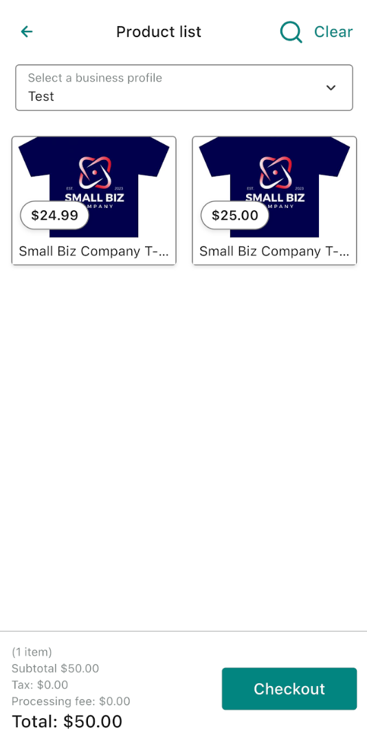 - Browse the available products. Tap on a product to add it to the cart. Click on the product more than once to add more quantity. Review the subtotal and total at the bottom tap Checkout.
