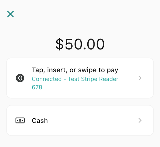 - Select a payment method: Card (tap, insert, or swipe) using a connected terminal or Cash