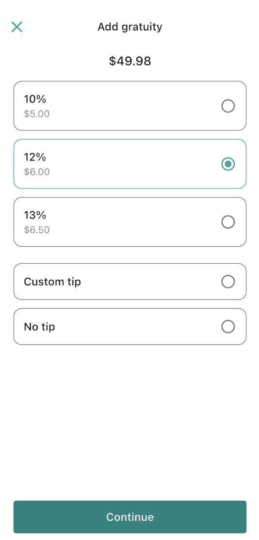 Choose a tip amount if you are using the card payment method (if enabled, learn more about this setting here). Select a preset percentage or enter a custom tip.