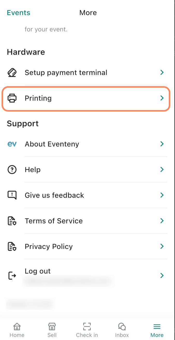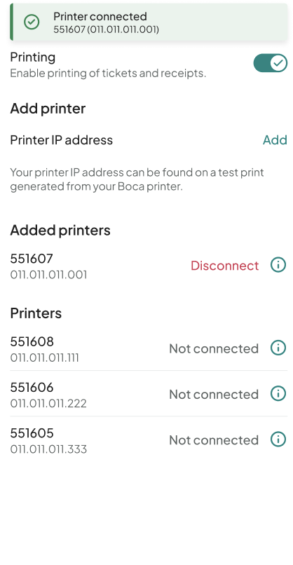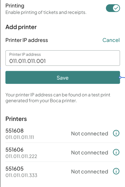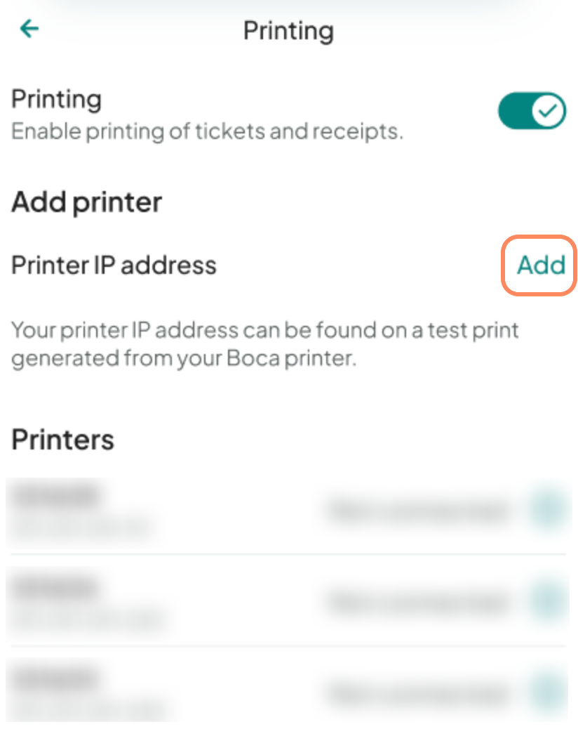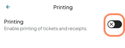Tap the Printing toggle to turn it on. Once enabled, this allows the app to print tickets and receipts and unlocks the option to add a printer.