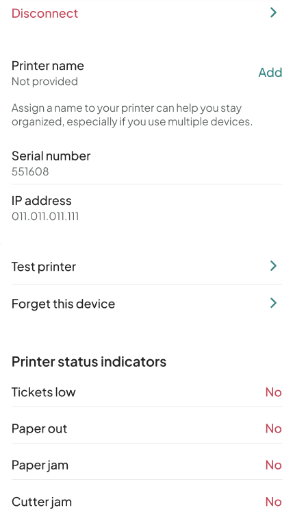Tap the info icon next to a connected printer to view its details. From this screen, you can: