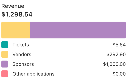 At the top, you’ll see your total revenue. This is broken down by category: Tickets, Vendors, Sponsor, and Other Applications. This helps you quickly understand where your money is coming from.