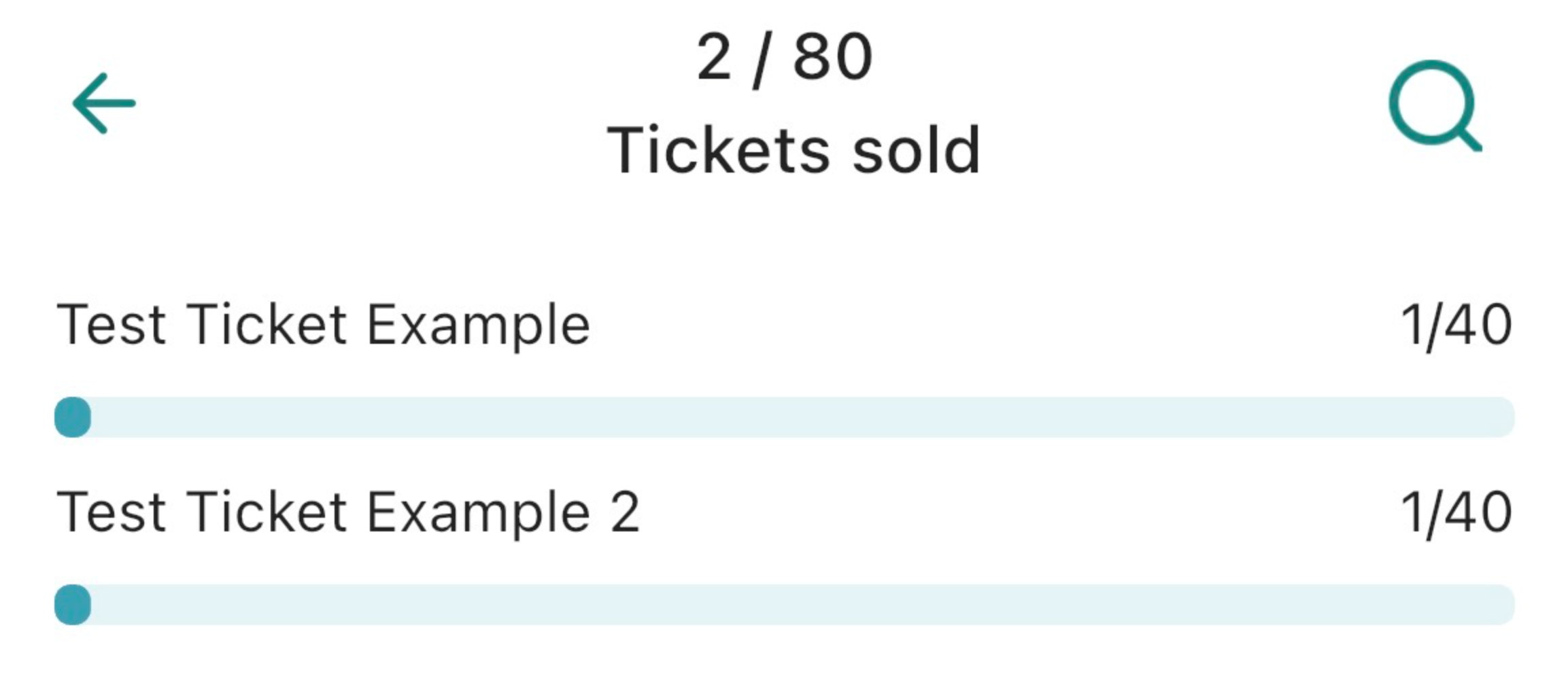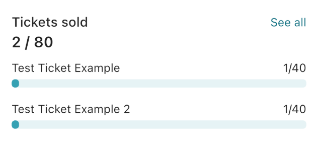 The Tickets Sold section shows how many tickets have been sold out of the total available, such as 2 out of 80 tickets sold. You’ll also see a breakdown by ticket type, like Test Ticket Example and Test Ticket Example 2, each showing how many have been sold out of their individual limits. This helps you understand sales performance by ticket type and how close you are to selling out.