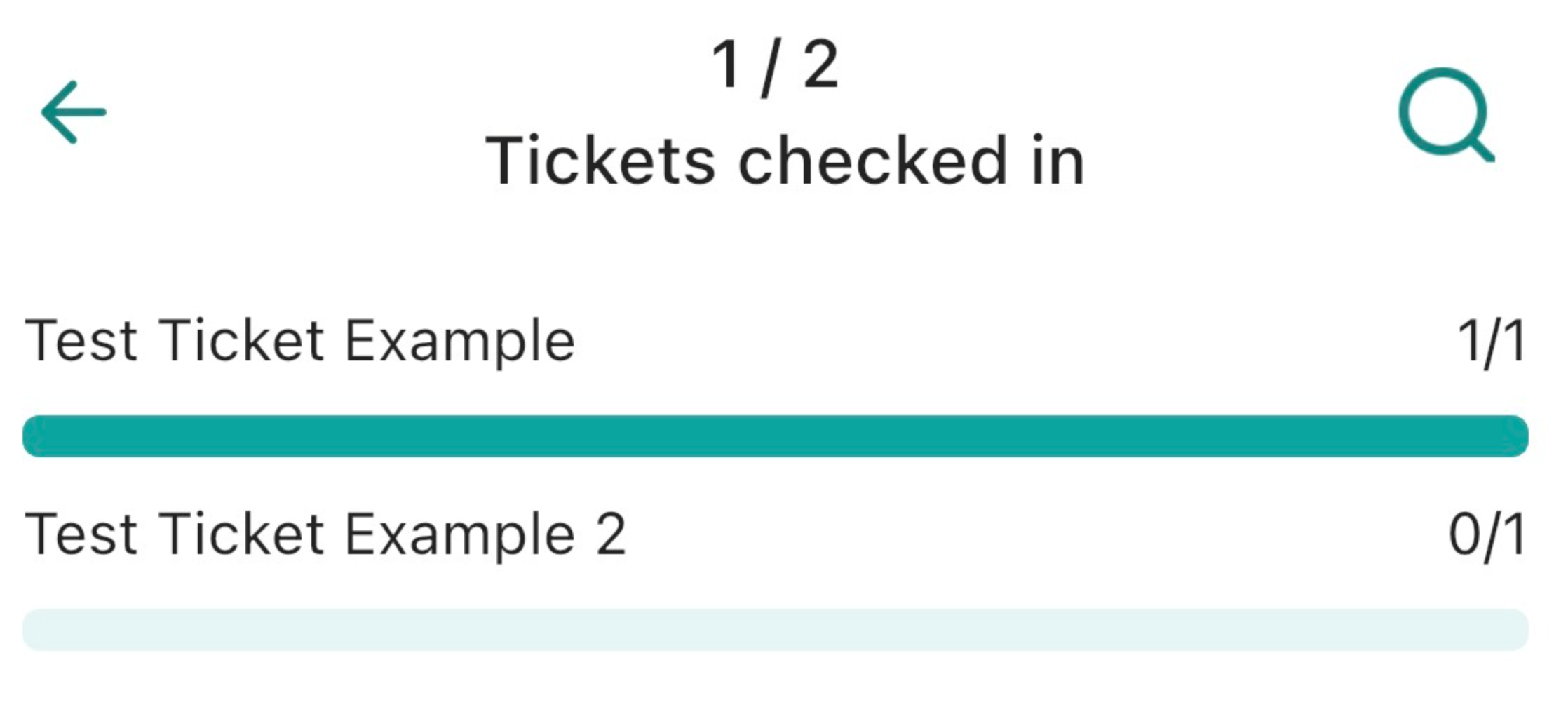 The Tickets Checked In section shows how many tickets have been scanned at the event, such as 1 out of 2 tickets checked in. You’ll also see a breakdown by ticket type, like Test Ticket Example and Test Ticket Example 2, showing how many attendees from each type have checked in. This helps you track attendance in real time and see which ticket types are being used.