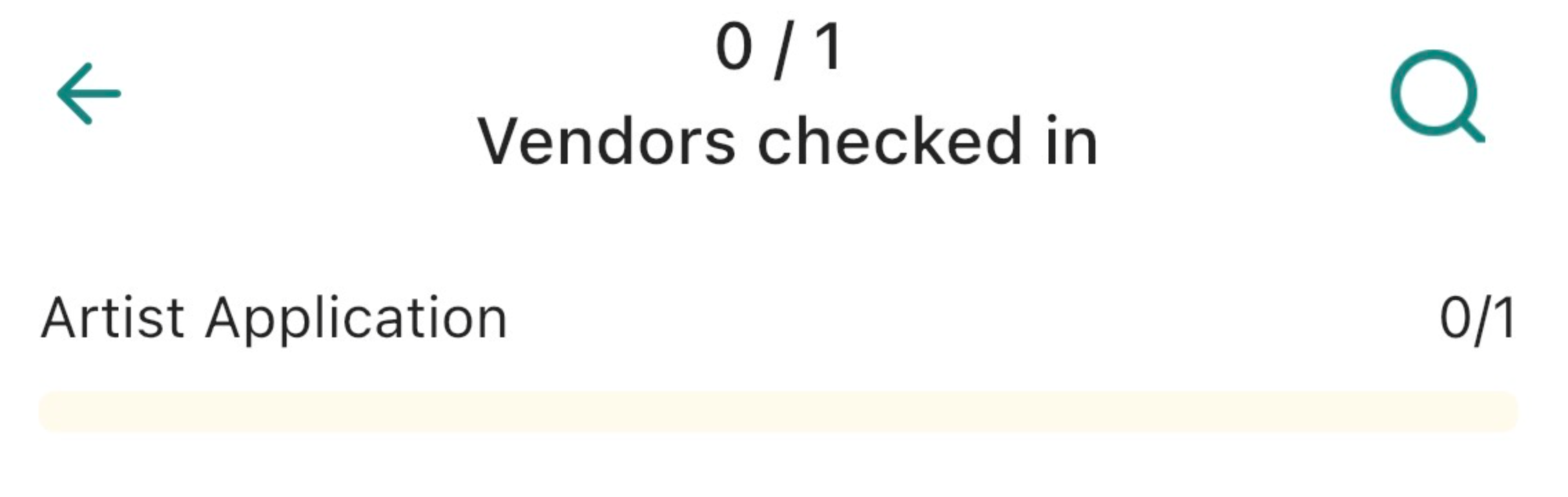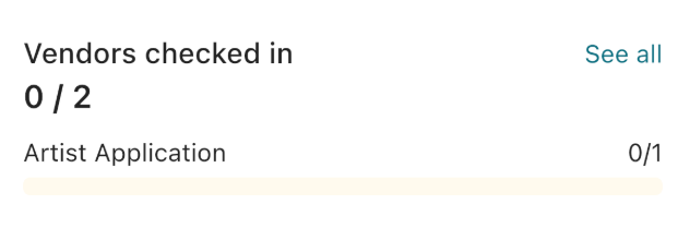 The Vendors Checked In section shows how many vendors have checked in for the event, such as 0 out of 2 vendors checked in. You may also see a breakdown by application type (like Artist Application), showing how many vendors from each group have arrived. This helps you track vendor attendance in real time and ensure all participants are accounted for.