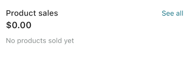 The Product Sales section shows the total revenue generated from products sold through your event, such as $0.00 if no sales have been made yet. It will also indicate whether any products have been sold, and you can tap “See all” to view a detailed breakdown of product transactions. This helps you track on-site or in-app sales performance in real time.
