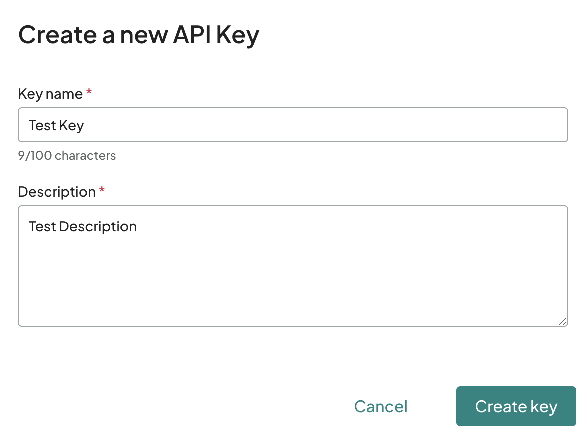 - Enter a name for the key and a short description for the key. Click Create Key.
